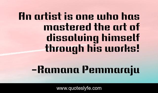 This page presents the quote "An artist is one who has mastered the art of dissolving himself through his works!". Author of this quote is Ramana Pemmaraju. This quote is about art, dissolve, creativityvity, artist,.