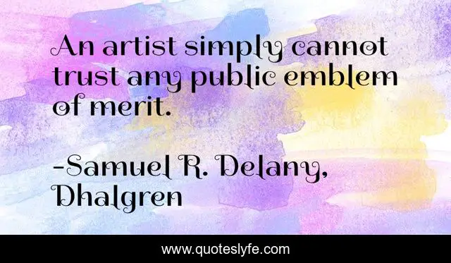 This page presents the quote "An artist simply cannot trust any public emblem of merit.". Author of this quote is Samuel R. Delany, Dhalgren. This quote is about opinion, art, public,.