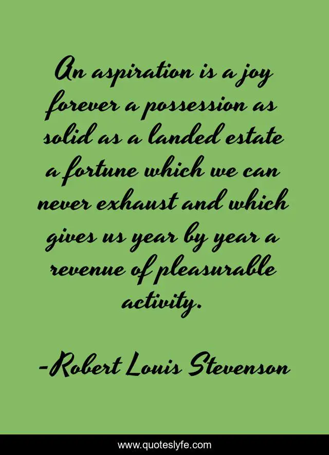 This page presents the quote "An aspiration is a joy forever a possession as solid as a landed estate a fortune which we can never exhaust and which gives us year by year a revenue of pleasurable activity.". Author of this quote is Robert Louis Stevenson. .