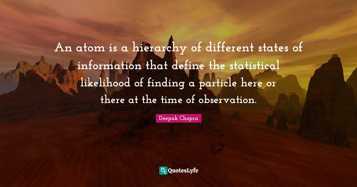 This page presents the quote "An atom is a hierarchy of different states of information that define the statistical likelihood of finding a particle here or there at the time of observation.". Author of this quote is Deepak Chopra. This quote is about atoms, time, observation, likelihood, states, hierarchy, different, information,.