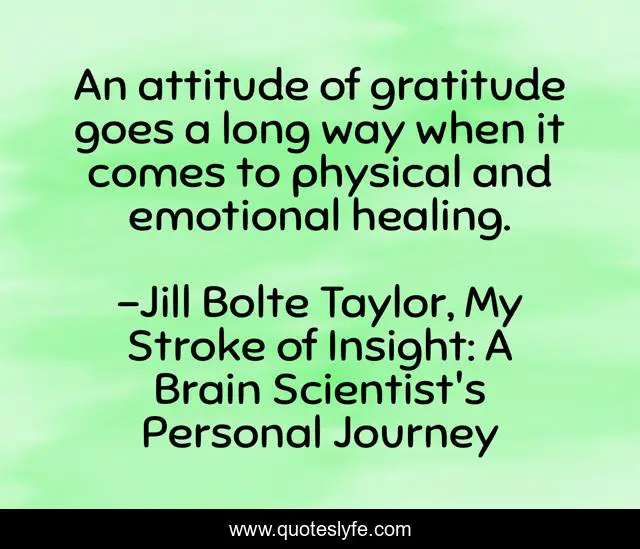 This page presents the quote "An attitude of gratitude goes a long way when it comes to physical and emotional healing.". Author of this quote is Jill Bolte Taylor, My Stroke of Insight: A Brain Scientist's Personal Journey. This quote is about science, inspirational, enthusiasm,.