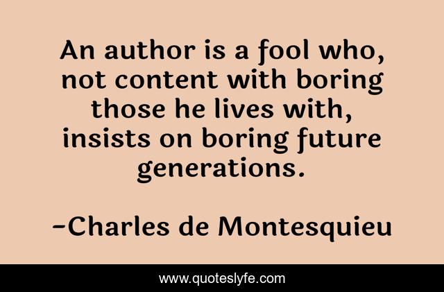 This page presents the quote "An author is a fool who, not content with boring those he lives with, insists on boring future generations.". Author of this quote is Charles de Montesquieu. This quote is about fool, content, boring,.