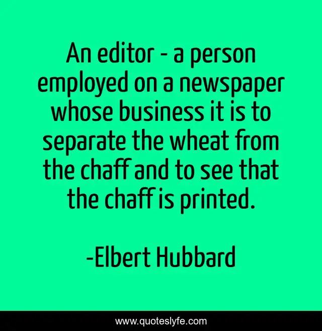 This page presents the quote "An editor - a person employed on a newspaper whose business it is to separate the wheat from the chaff and to see that the chaff is printed.". Author of this quote is Elbert Hubbard. This quote is about newspapers, journalism,.