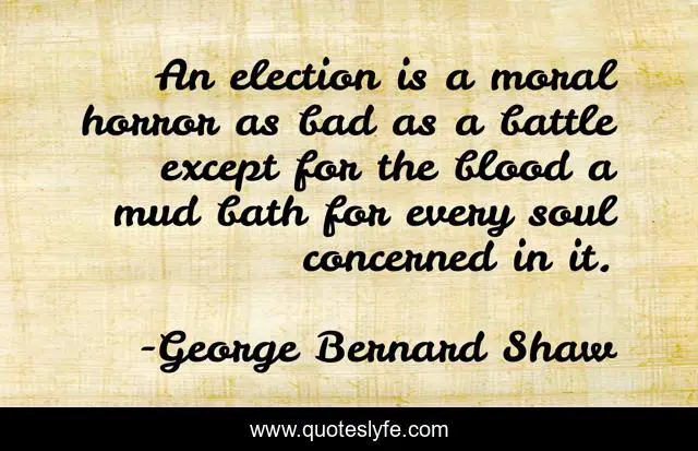 This page presents the quote "An election is a moral horror as bad as a battle except for the blood a mud bath for every soul concerned in it.". Author of this quote is George Bernard Shaw. This quote is about ethics, morality,.