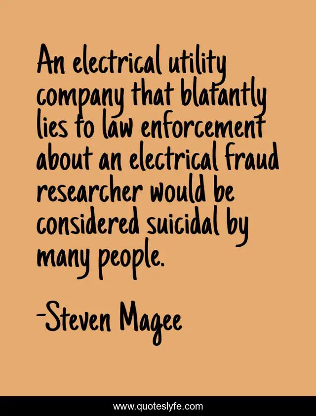 This page presents the quote "An electrical utility company that blatantly lies to law enforcement about an electrical fraud researcher would be considered suicidal by many people.". Author of this quote is Steven Magee. This quote is about blatantly, enforcement, fraud, suicidal, power, people, considered, corporation, company,.