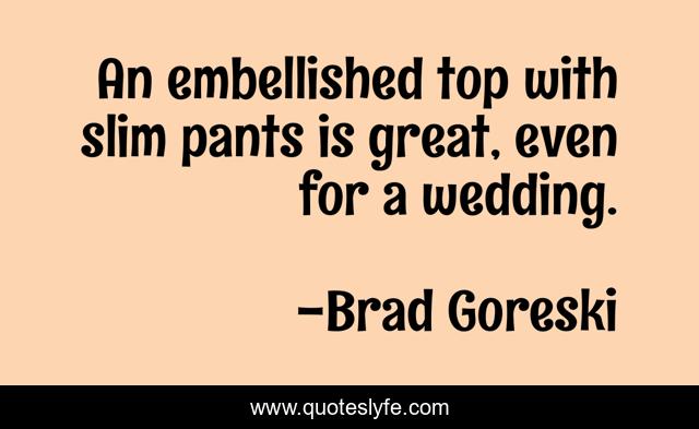 This page presents the quote "An embellished top with slim pants is great, even for a wedding.". Author of this quote is Brad Goreski. This quote is about great, top, pants,.