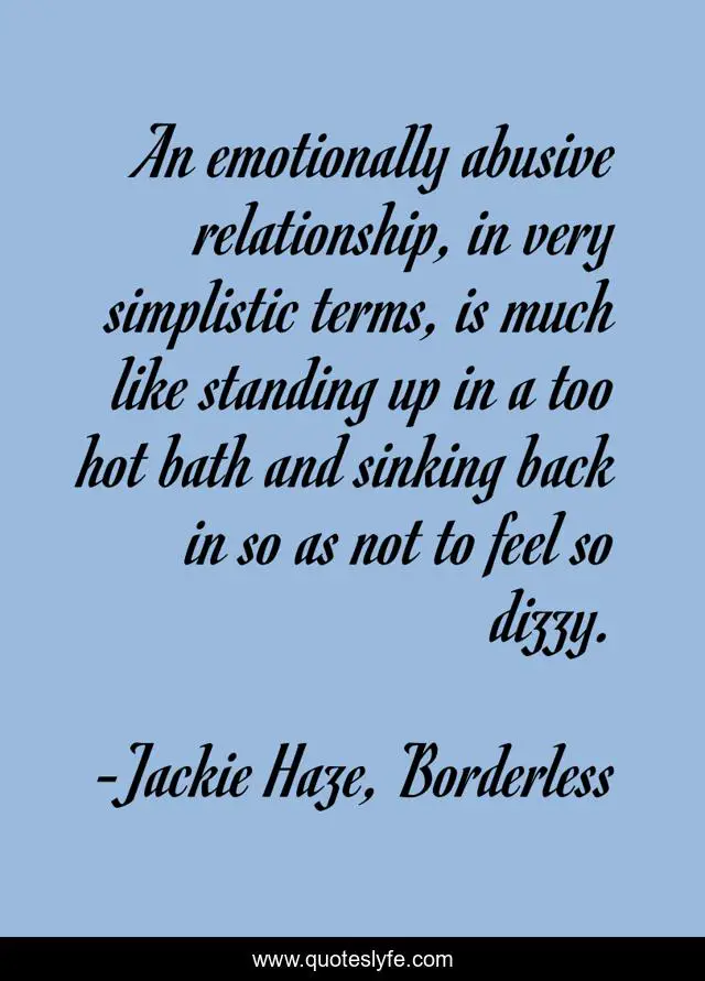 This page presents the quote "An emotionally abusive relationship, in very simplistic terms, is much like standing up in a too hot bath and sinking back in so as not to feel so dizzy.". Author of this quote is Jackie Haze, Borderless. This quote is about relationships, loss, life, love, abuse, confusion, narcissistic-abuse, emotional-abuse, grief,.