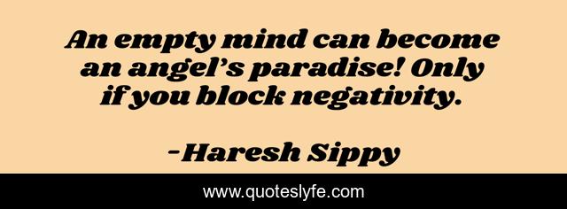 This page presents the quote "An empty mind can become an angel’s paradise! Only if you block negativity.". Author of this quote is Haresh Sippy. This quote is about empty-mind, positive-thinking,.