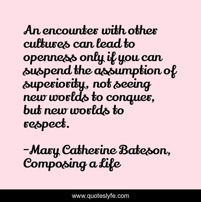 This page presents the quote "An encounter with other cultures can lead to openness only if you can suspend the assumption of superiority, not seeing new worlds to conquer, but new worlds to respect.". Author of this quote is Mary Catherine Bateson, Composing a Life. This quote is about anthropology, culture, openness,.