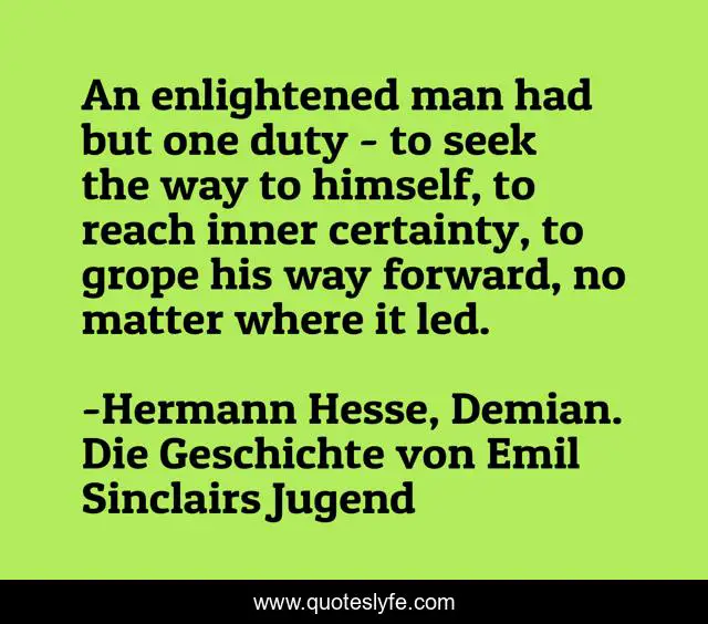 This page presents the quote "An enlightened man had but one duty - to seek the way to himself, to reach inner certainty, to grope his way forward, no matter where it led.". Author of this quote is Hermann Hesse, Demian. Die Geschichte von Emil Sinclairs Jugend. This quote is about demian, duty, enlightenment, hermann-hesse,.
