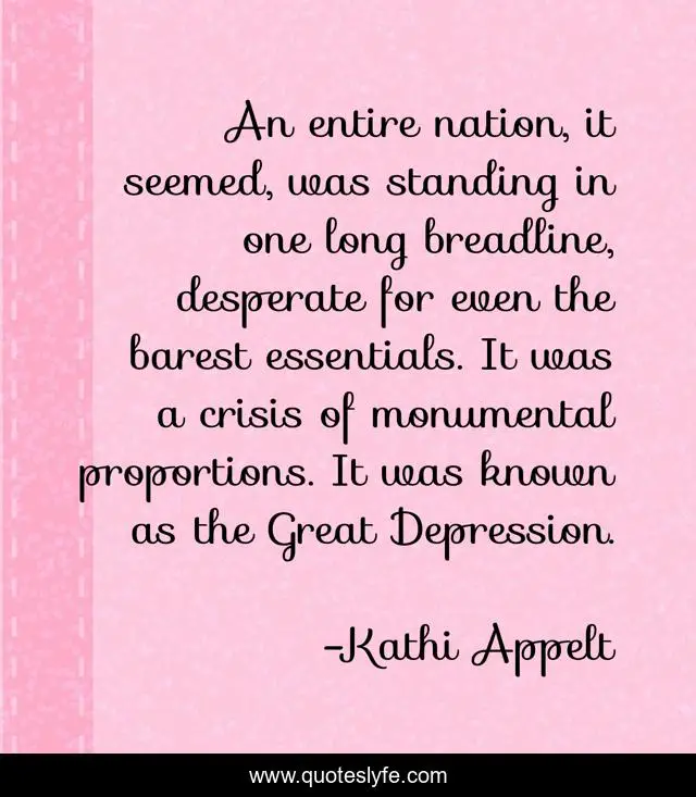 This page presents the quote "An entire nation, it seemed, was standing in one long breadline, desperate for even the barest essentials. It was a crisis of monumental proportions. It was known as the Great Depression.". Author of this quote is Kathi Appelt. This quote is about depression, long, crisis,.