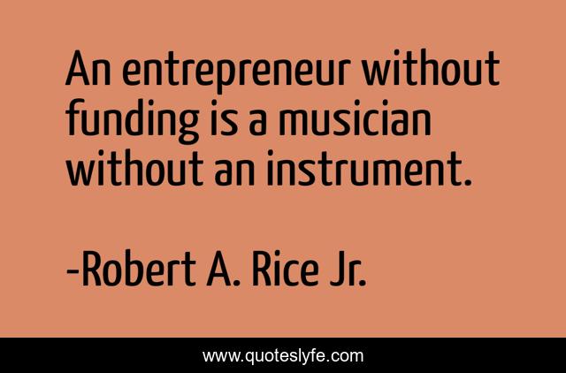 This page presents the quote "An entrepreneur without funding is a musician without an instrument.". Author of this quote is Robert A. Rice Jr.. This quote is about funding, business, entrepreneur, musician, startup, instrument,.
