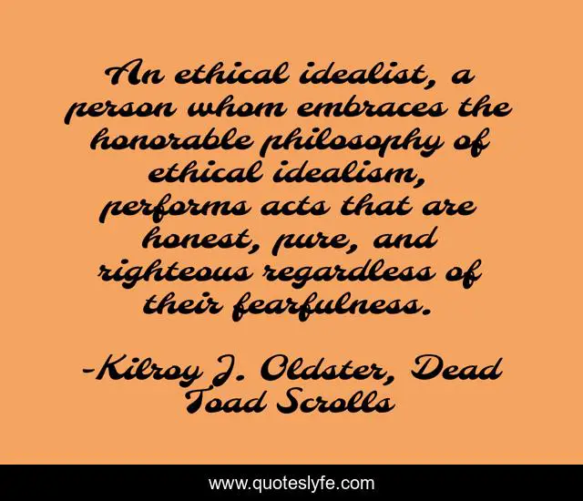 This page presents the quote "An ethical idealist, a person whom embraces the honorable philosophy of ethical idealism, performs acts that are honest, pure, and righteous regardless of their fearfulness.". Author of this quote is Kilroy J. Oldster, Dead Toad Scrolls. This quote is about idealism, honesty, idealistic, idealists, honest, ethics, integrity, idealistic-people, ethics-and-moral-philosophy,.