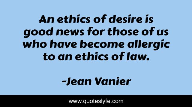 This page presents the quote "An ethics of desire is good news for those of us who have become allergic to an ethics of law.". Author of this quote is Jean Vanier. This quote is about enthusiasm, ethics, l-arche, inspirational,.