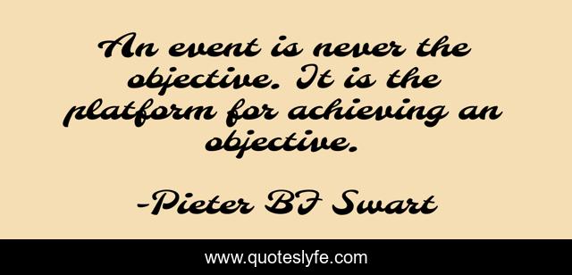 This page presents the quote "An event is never the objective. It is the platform for achieving an objective.". Author of this quote is Pieter BF Swart. This quote is about objective, platform, event, achieve,.