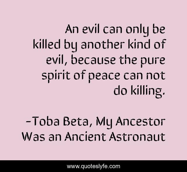 This page presents the quote "An evil can only be killed by another kind of evil, because the pure spirit of peace can not do killing.". Author of this quote is Toba Beta, My Ancestor Was an Ancient Astronaut. This quote is about each-other, life, peace, evil, pure-spirit, secret, kill,.
