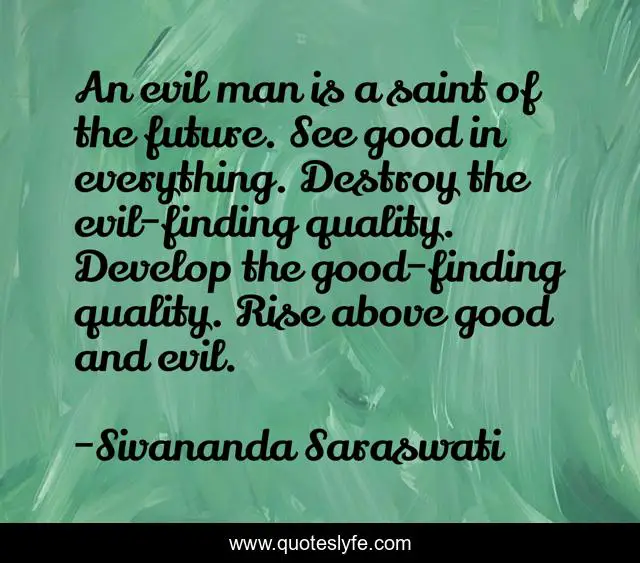 This page presents the quote "An evil man is a saint of the future. See good in everything. Destroy the evil-finding quality. Develop the good-finding quality. Rise above good and evil.". Author of this quote is Sivananda Saraswati. This quote is about judgement, good, spirit, evil,.