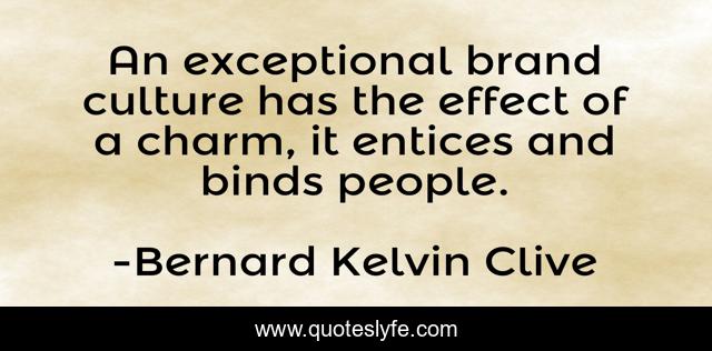 This page presents the quote "An exceptional brand culture has the effect of a charm, it entices and binds people.". Author of this quote is Bernard Kelvin Clive. This quote is about consumer-brands, branding, brand-culture, brand-values, personal-branding,.