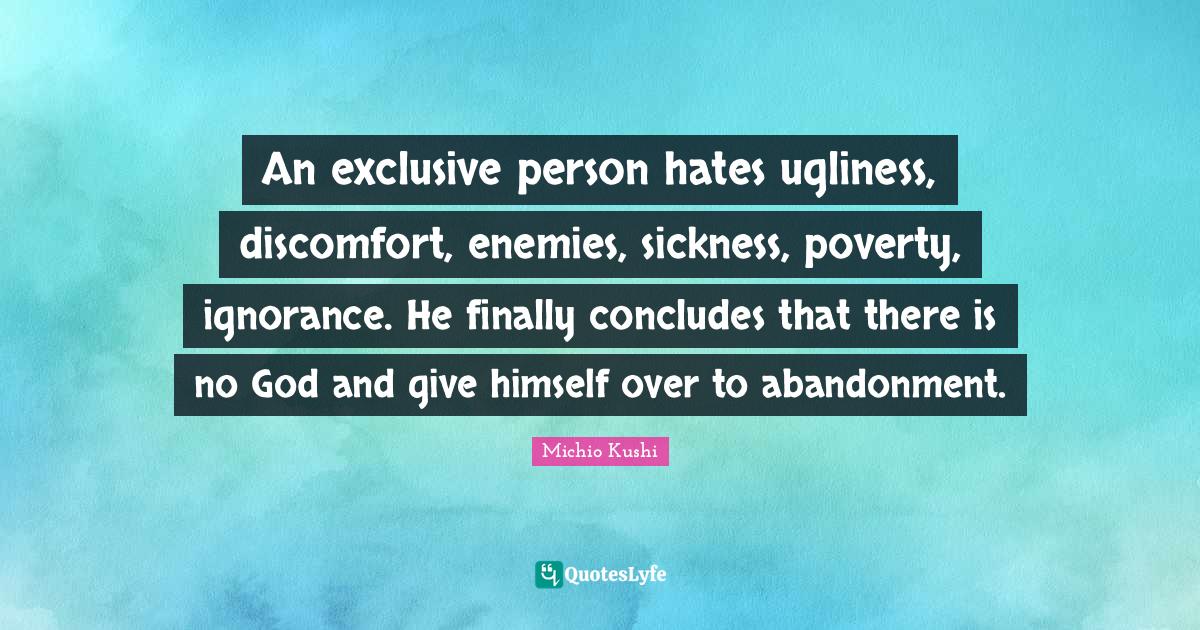 This page presents the quote "An exclusive person hates ugliness, discomfort, enemies, sickness, poverty, ignorance. He finally concludes that there is no God and give himself over to abandonment.". Author of this quote is Michio Kushi. This quote is about discomfort, poverty, abandonment, sickness, ignorance, giving, ugliness, hate, exclusive,.