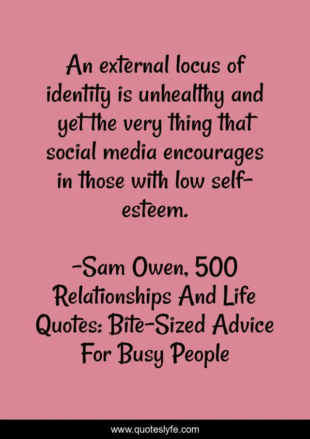 This page presents the quote "An external locus of identity is unhealthy and yet the very thing that social media encourages in those with low self-esteem.". Author of this quote is Sam Owen, 500 Relationships And Life Quotes: Bite-Sized Advice For Busy People. This quote is about relationships, confidence, external-locus-of-identity, social-media, self-esteem,.