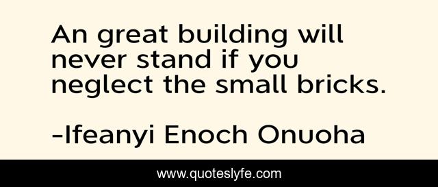 This page presents the quote "An great building will never stand if you neglect the small bricks.". Author of this quote is Ifeanyi Enoch Onuoha. This quote is about building, goal, idea, wisdom, extraordinary, ifeanyi-enoch-onuoha, teamwork, brick, ordinary,.