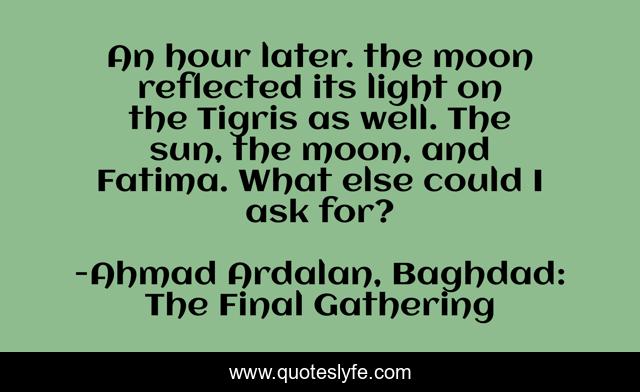 This page presents the quote "An hour later. the moon reflected its light on the Tigris as well. The sun, the moon, and Fatima. What else could I ask for?". Author of this quote is Ahmad Ardalan, Baghdad: The Final Gathering. This quote is about life, love, romantic, fate, moon, romance, baghdad, passion, hope,.