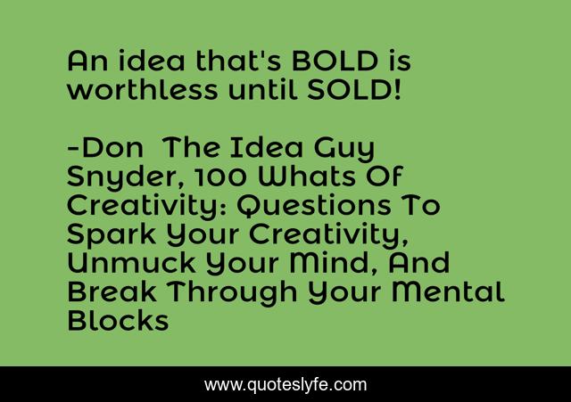 This page presents the quote "An idea that's BOLD is worthless until SOLD!". Author of this quote is Don The Idea Guy Snyder, 100 Whats Of Creativity: Questions To Spark Your Creativity, Unmuck Your Mind, And Break Through Your Mental Blocks. This quote is about creativity, ideas, don-snyder, don-the-idea-guy, brainstorming, innovation,.