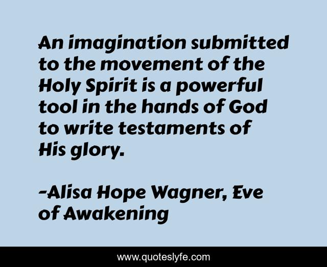 This page presents the quote "An imagination submitted to the movement of the Holy Spirit is a powerful tool in the hands of God to write testaments of His glory.". Author of this quote is Alisa Hope Wagner, Eve of Awakening. This quote is about faith, glory, god, writing, imagination, holy-spirit,.