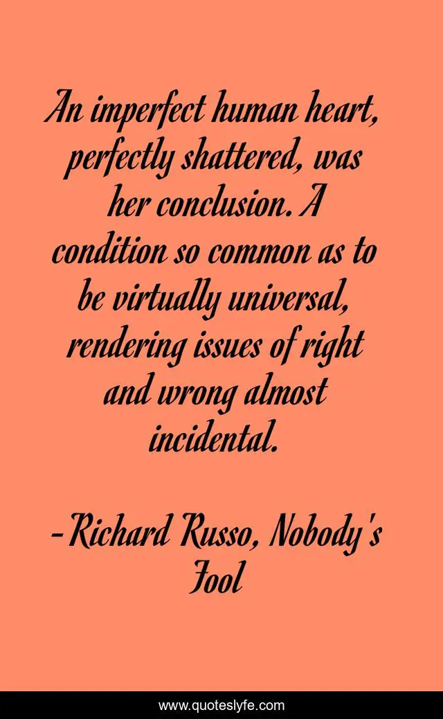 This page presents the quote "An imperfect human heart, perfectly shattered, was her conclusion. A condition so common as to be virtually universal, rendering issues of right and wrong almost incidental.". Author of this quote is Richard Russo, Nobody's Fool. This quote is about life, morality,.