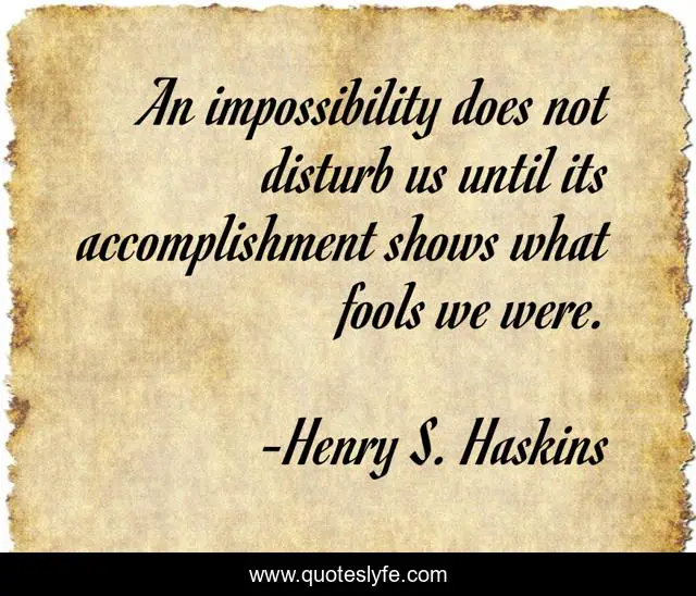 This page presents the quote "An impossibility does not disturb us until its accomplishment shows what fools we were.". Author of this quote is Henry S. Haskins. .