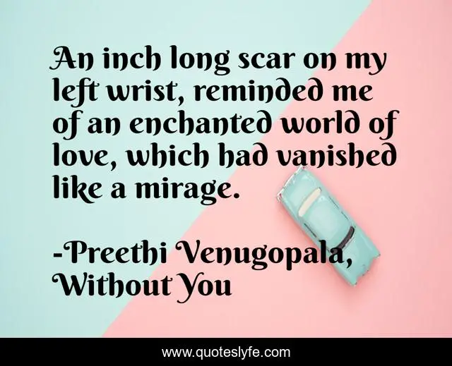 This page presents the quote "An inch long scar on my left wrist, reminded me of an enchanted world of love, which had vanished like a mirage.". Author of this quote is Preethi Venugopala, Without You. .