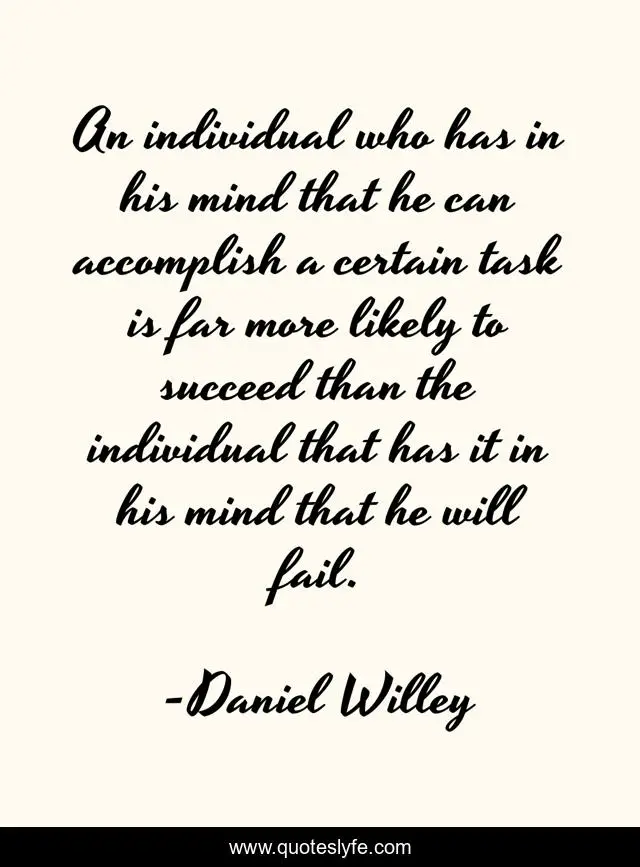 This page presents the quote "An individual who has in his mind that he can accomplish a certain task is far more likely to succeed than the individual that has it in his mind that he will fail.". Author of this quote is Daniel Willey. This quote is about motivation, tasks, inspire, mind, brain, individual, optimistic, fail, uplift,.