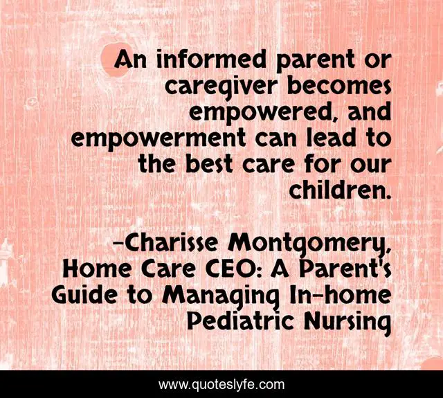 This page presents the quote "An informed parent or caregiver becomes empowered, and empowerment can lead to the best care for our children.". Author of this quote is Charisse Montgomery, Home Care CEO: A Parent's Guide to Managing In-home Pediatric Nursing. This quote is about power, empower, informed, parents, caregiver, children,.