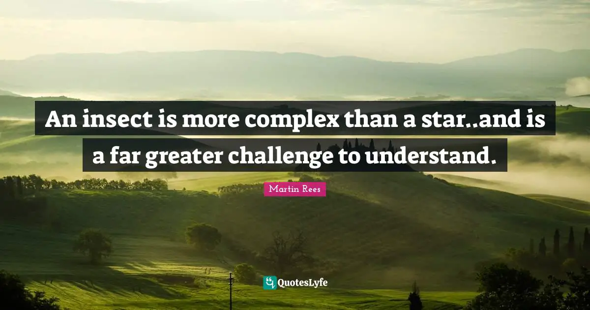 This page presents the quote "An insect is more complex than a star..and is a far greater challenge to understand.". Author of this quote is Martin Rees. This quote is about greater, challenges, stars, insects,.