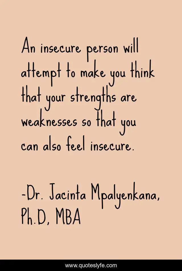 This page presents the quote "An insecure person will attempt to make you think that your strengths are weaknesses so that you can also feel insecure.". Author of this quote is Dr. Jacinta Mpalyenkana, Ph.D, MBA. This quote is about insecurity, confidence, self-esteem, self-worth,.