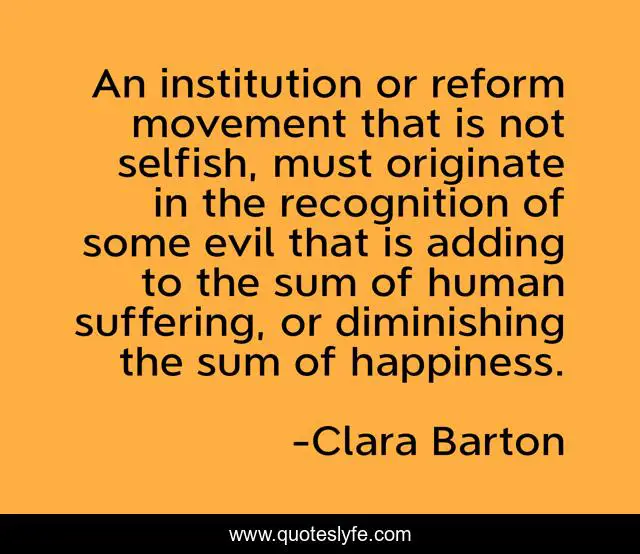 This page presents the quote "An institution or reform movement that is not selfish, must originate in the recognition of some evil that is adding to the sum of human suffering, or diminishing the sum of happiness.". Author of this quote is Clara Barton. This quote is about selfish, suffering, evil,.
