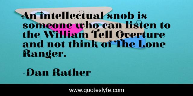 This page presents the quote "An intellectual snob is someone who can listen to the William Tell Overture and not think of The Lone Ranger.". Author of this quote is Dan Rather. This quote is about television, snobbery, elitism, music, scholars, scholarship,.