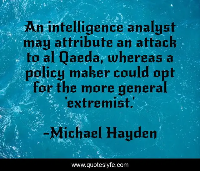 This page presents the quote "An intelligence analyst may attribute an attack to al Qaeda, whereas a policy maker could opt for the more general 'extremist.'". Author of this quote is Michael Hayden. This quote is about policy, may, general,.