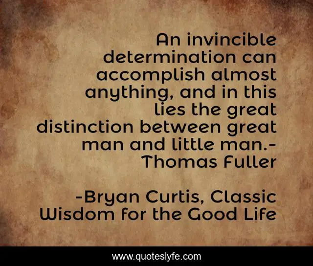 This page presents the quote "An invincible determination can accomplish almost anything, and in this lies the great distinction between great man and little man.- Thomas Fuller". Author of this quote is Bryan Curtis, Classic Wisdom for the Good Life. .