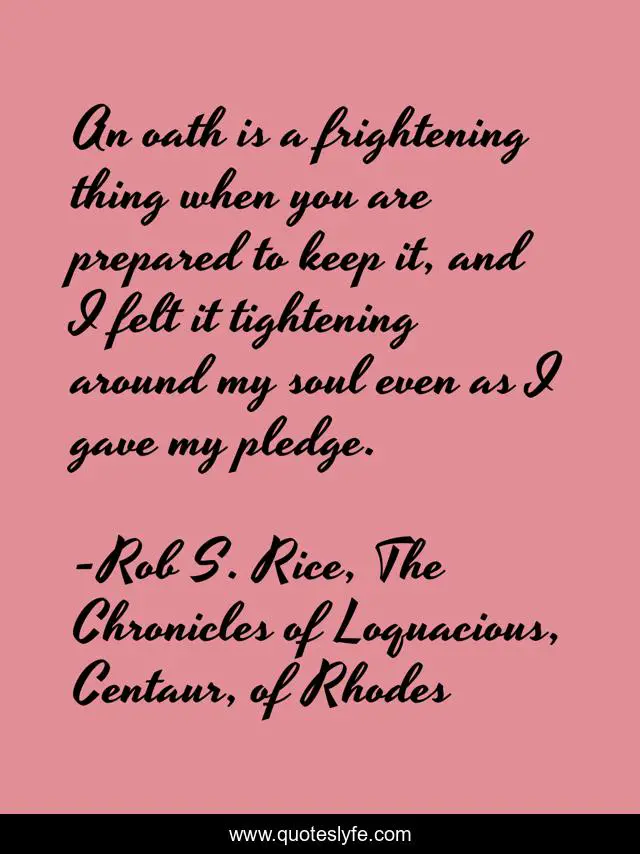 This page presents the quote "An oath is a frightening thing when you are prepared to keep it, and I felt it tightening around my soul even as I gave my pledge.". Author of this quote is Rob S. Rice, The Chronicles of Loquacious, Centaur, of Rhodes. This quote is about faith, oath, honor, soul,.