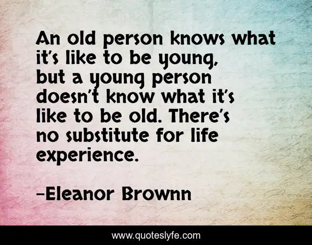This page presents the quote "An old person knows what it’s like to be young, but a young person doesn’t know what it’s like to be old. There’s no substitute for life experience.". Author of this quote is Eleanor Brownn. This quote is about aging, wisdom, youth, maturity, perspective, inspirational, enthusiasm,.