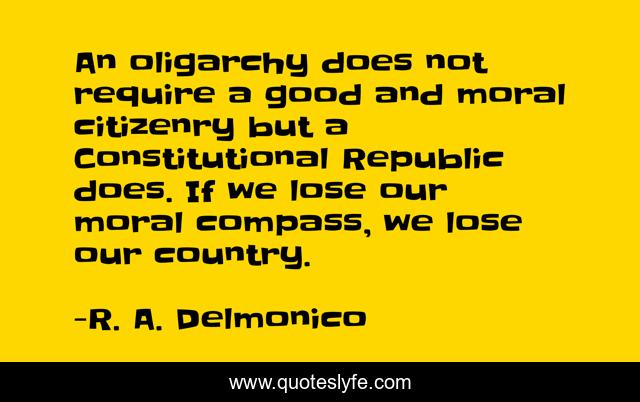 This page presents the quote "An oligarchy does not require a good and moral citizenry but a Constitutional Republic does. If we lose our moral compass, we lose our country.". Author of this quote is R. A. Delmonico. .