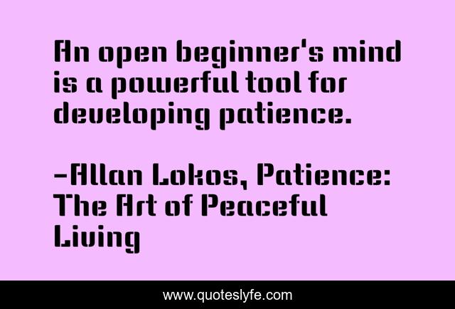 This page presents the quote "An open beginner's mind is a powerful tool for developing patience.". Author of this quote is Allan Lokos, Patience: The Art of Peaceful Living. This quote is about buddhism, psychology, mindfulness,.