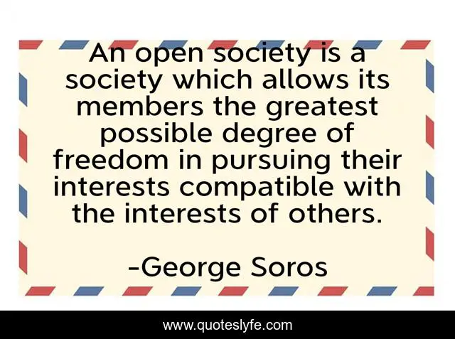 This page presents the quote "An open society is a society which allows its members the greatest possible degree of freedom in pursuing their interests compatible with the interests of others.". Author of this quote is George Soros. This quote is about freedom, greatest, possible,.