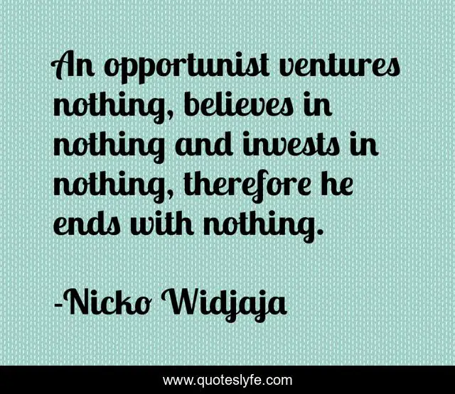 This page presents the quote "An opportunist ventures nothing, believes in nothing and invests in nothing, therefore he ends with nothing.". Author of this quote is Nicko Widjaja. This quote is about invest, opportunity, venture,.