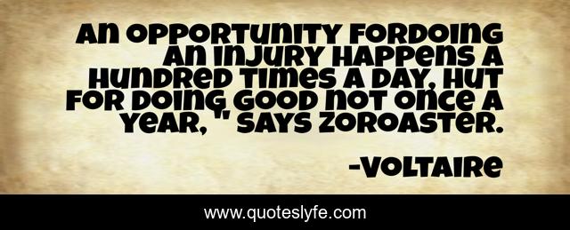 This page presents the quote "An opportunity fordoing an injury happens a hundred times a day, hut for doing good not once a year, " says Zoroaster.". Author of this quote is Voltaire. This quote is about zoroastro, voltaire, philosophy-of-life, zoroaster,.