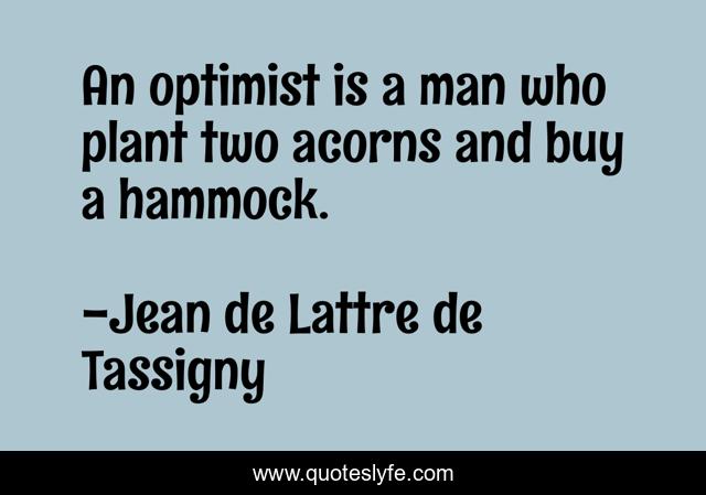 This page presents the quote "An optimist is a man who plant two acorns and buy a hammock.". Author of this quote is Jean de Lattre de Tassigny. This quote is about humor, acorns, tassigny, hammock, optimist, man,.