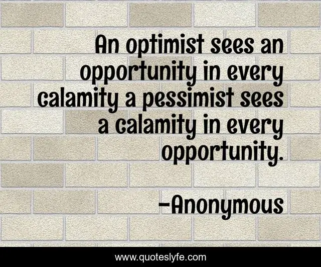 This page presents the quote "An optimist sees an opportunity in every calamity a pessimist sees a calamity in every opportunity.". Author of this quote is Anonymous. .