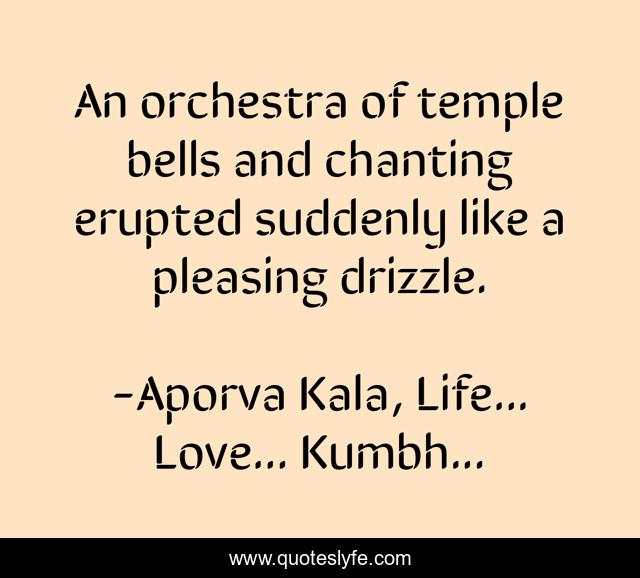 This page presents the quote "An orchestra of temple bells and chanting erupted suddenly like a pleasing drizzle.". Author of this quote is Aporva Kala, Life... Love... Kumbh.... This quote is about hinduism, prayer, religion-and-philosophy, religion,.
