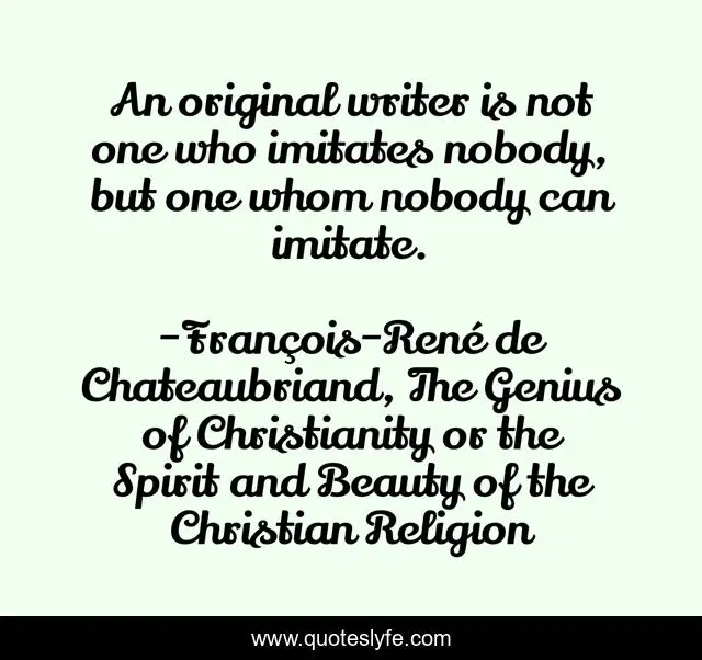 "François-René de Chateaubriand, The Genius of Christianity or the Spirit and Beauty of the Christian Religion Quotes." Quoteslyfe.com, 2025. Mon. 08 Dec. 2025. <https://www.quoteslyfe.com/quote/An-original-writer-is-not-one-who-27200>.